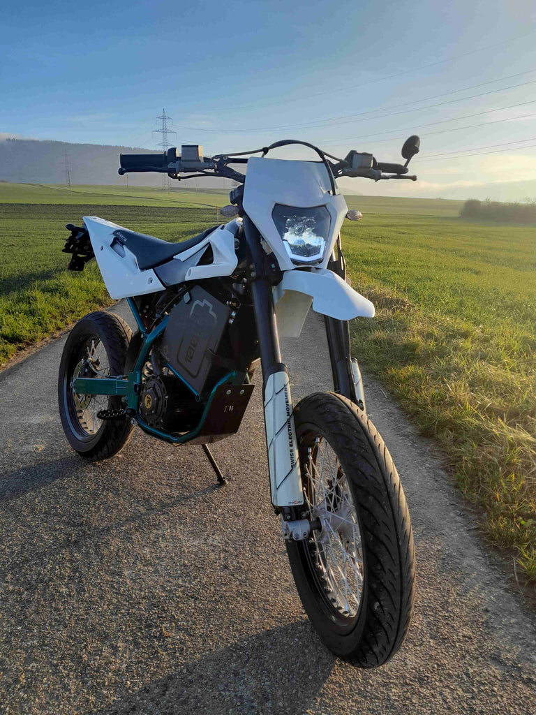 Rahmen pulverbeschichtet, neue Kunststoffteile, Supermoto-Räder, neue Bremsen, Brushless-Kit von Rubitech usw.